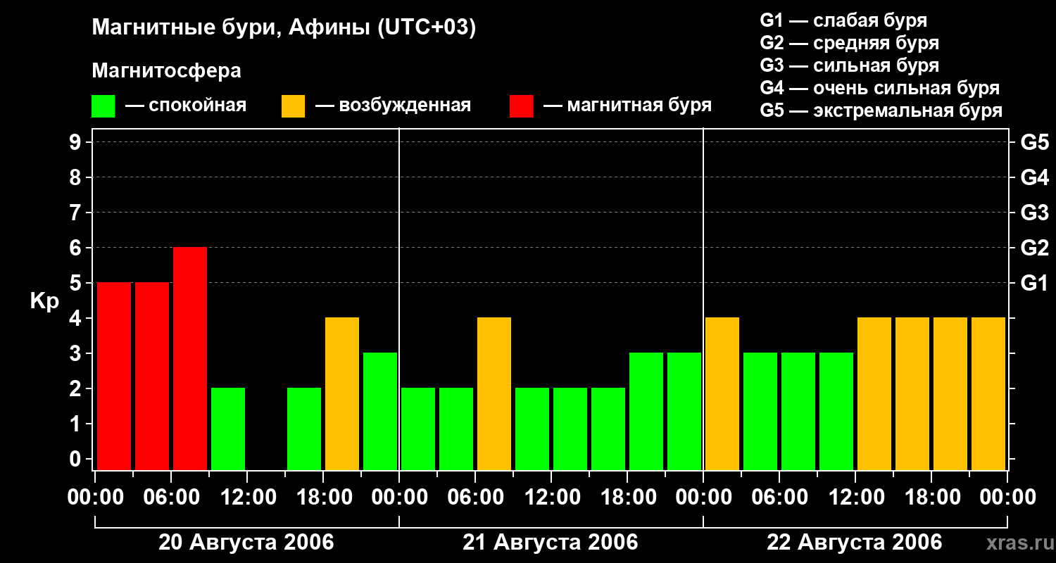 Изменения геомагнитного индекса Kp с 20 по 22 августа 2006 года для средних широт