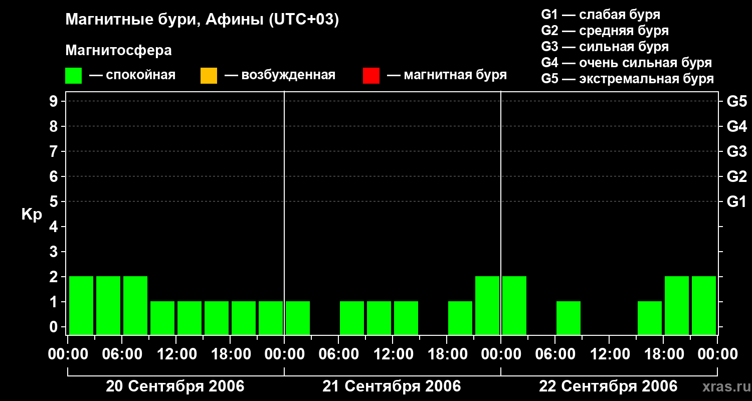 Изменения геомагнитного индекса Kp с 20 по 22 сентября 2006 года для средних широт