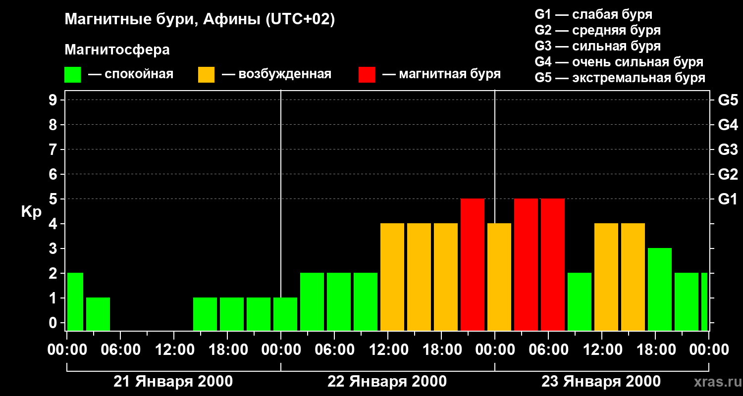 Изменения геомагнитного индекса Kp с 21 по 23 января 2000 года для средних широт