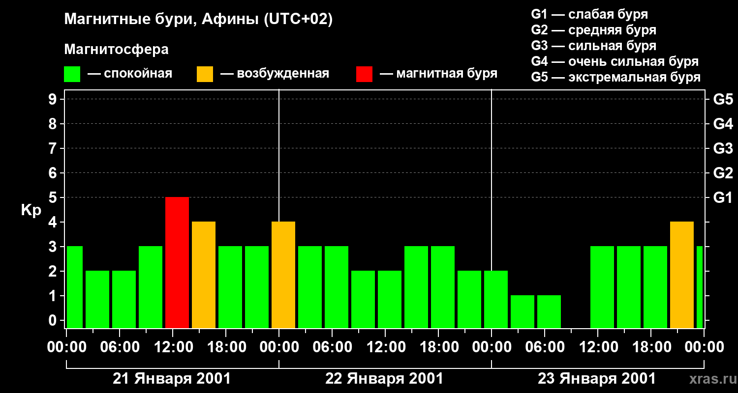 Изменения геомагнитного индекса Kp с 21 по 23 января 2001 года для средних широт