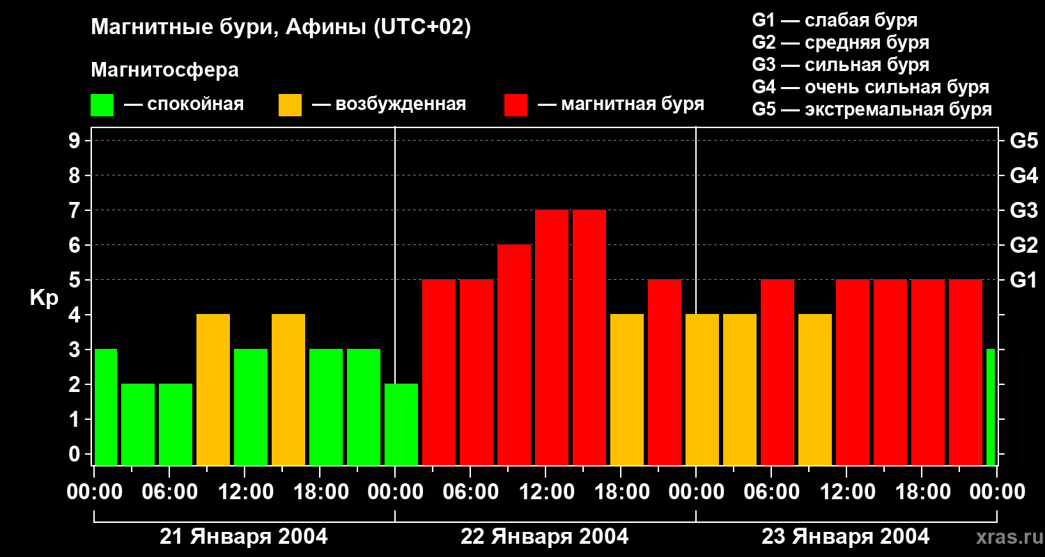 Изменения геомагнитного индекса Kp с 21 по 23 января 2004 года для средних широт