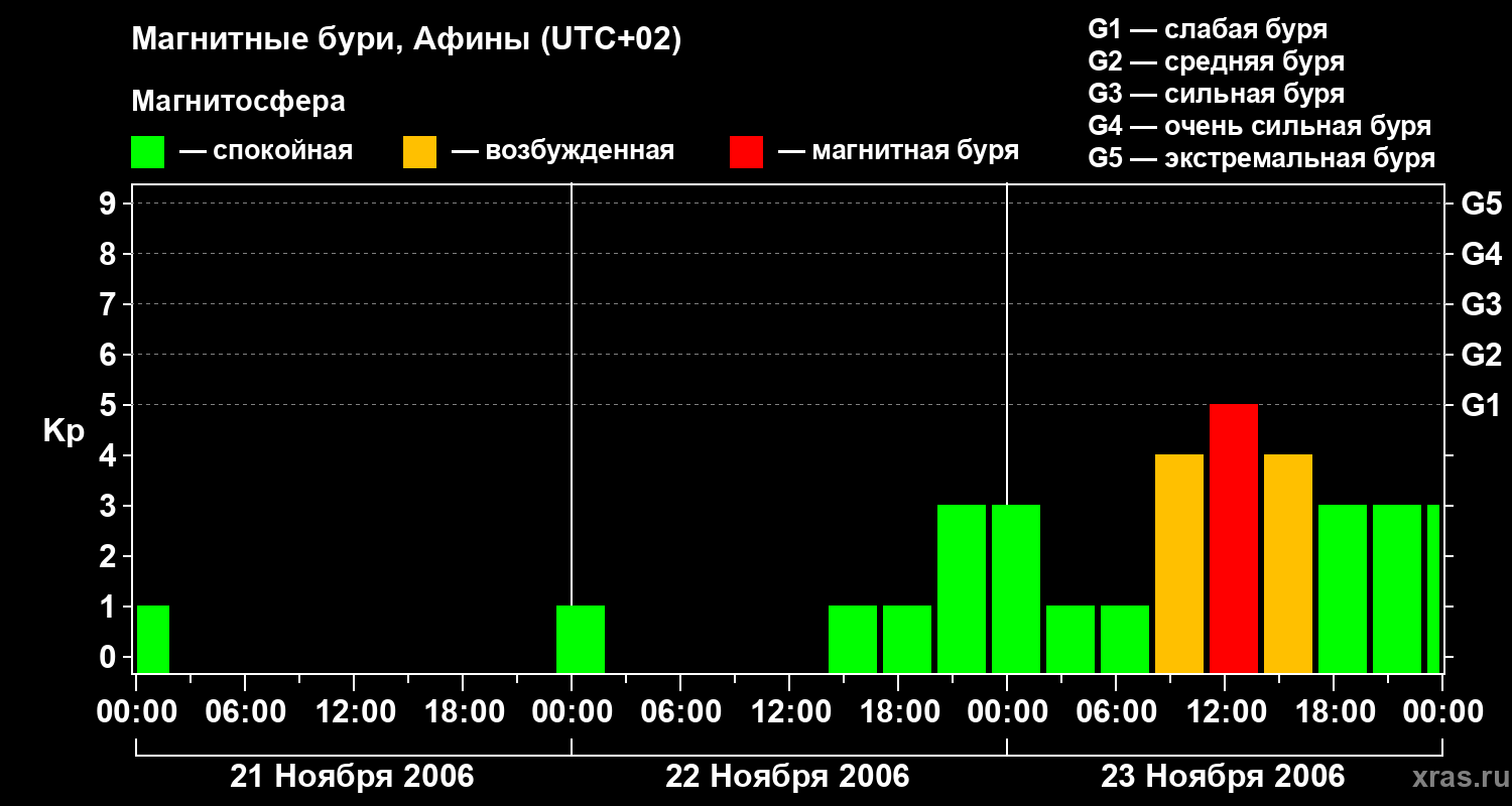 Изменения геомагнитного индекса Kp с 21 по 23 ноября 2006 года для средних широт