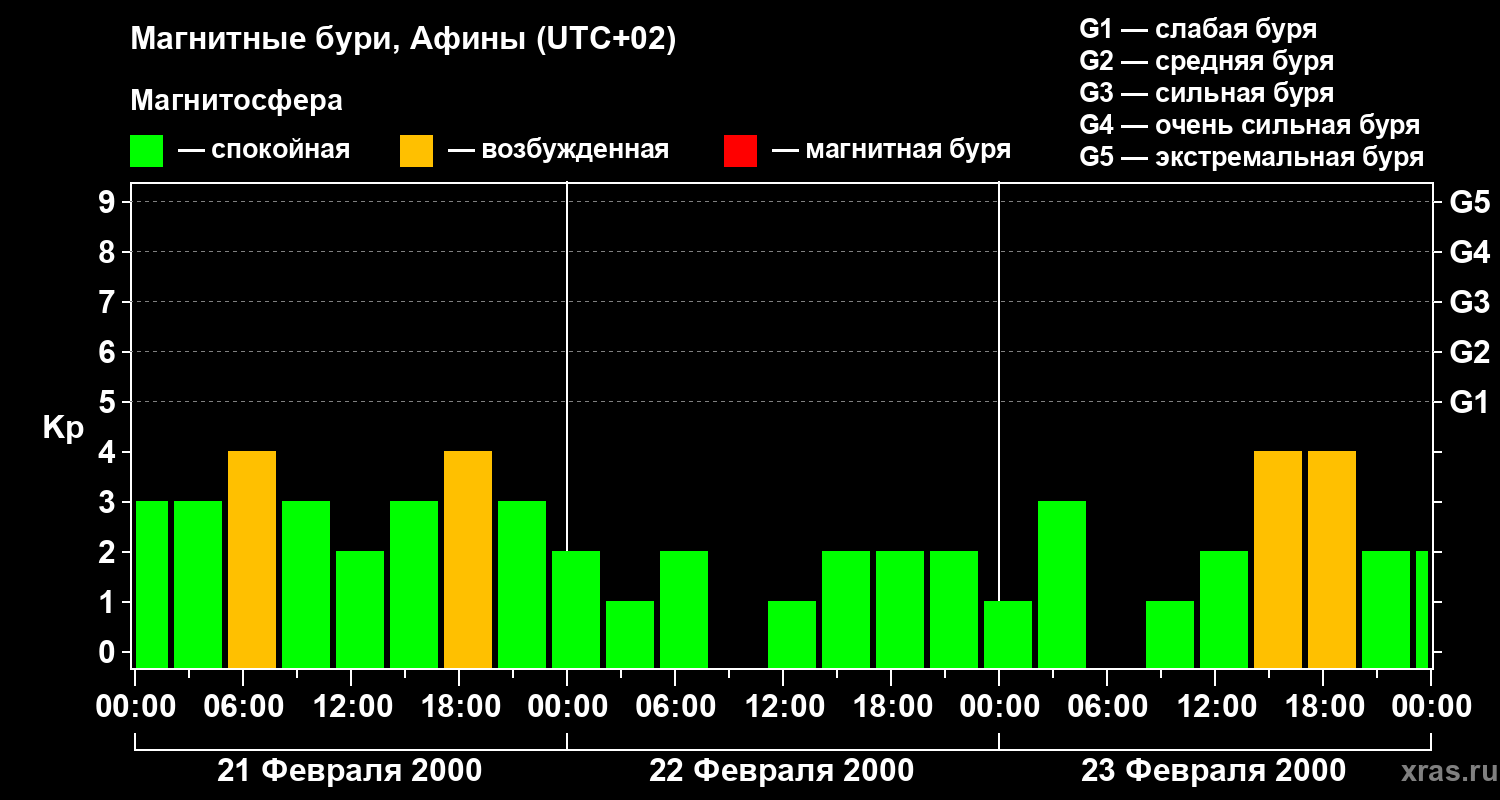 Изменения геомагнитного индекса Kp с 21 по 23 февраля 2000 года для средних широт
