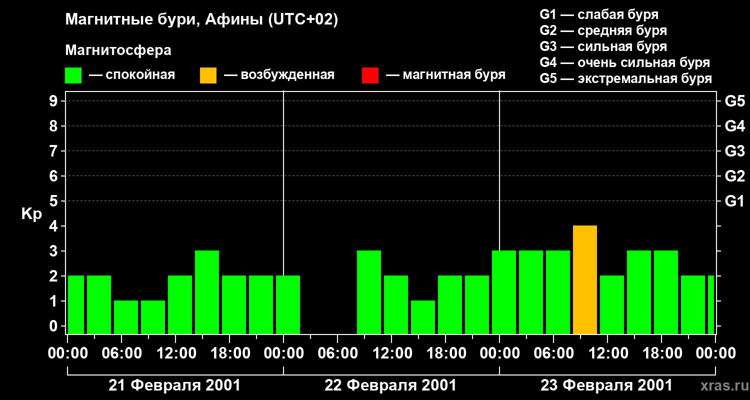 Изменения геомагнитного индекса Kp с 21 по 23 февраля 2001 года для средних широт