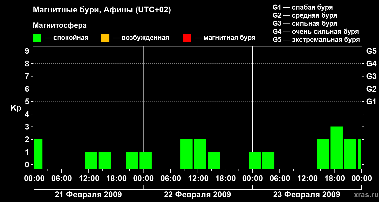 Изменения геомагнитного индекса Kp с 21 по 23 февраля 2009 года для средних широт