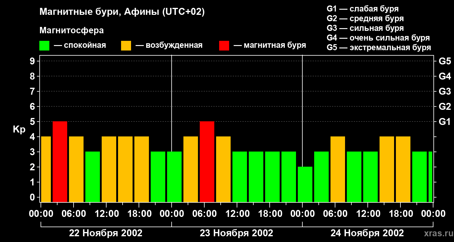 Изменения геомагнитного индекса Kp с 22 по 24 ноября 2002 года для средних широт