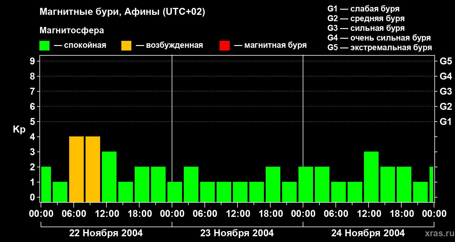 Изменения геомагнитного индекса Kp с 22 по 24 ноября 2004 года для средних широт