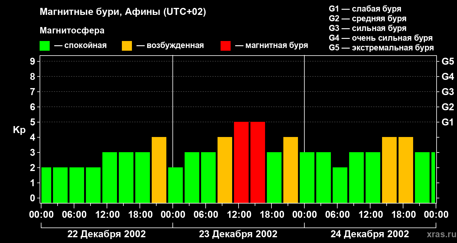 Изменения геомагнитного индекса Kp с 22 по 24 декабря 2002 года для средних широт
