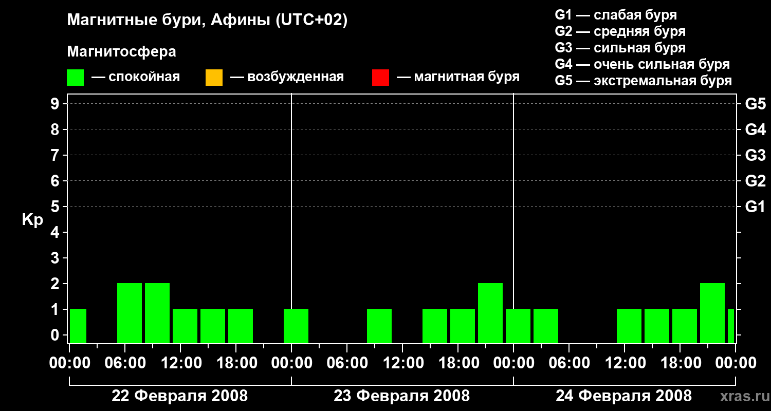 Изменения геомагнитного индекса Kp с 22 по 24 февраля 2008 года для средних широт