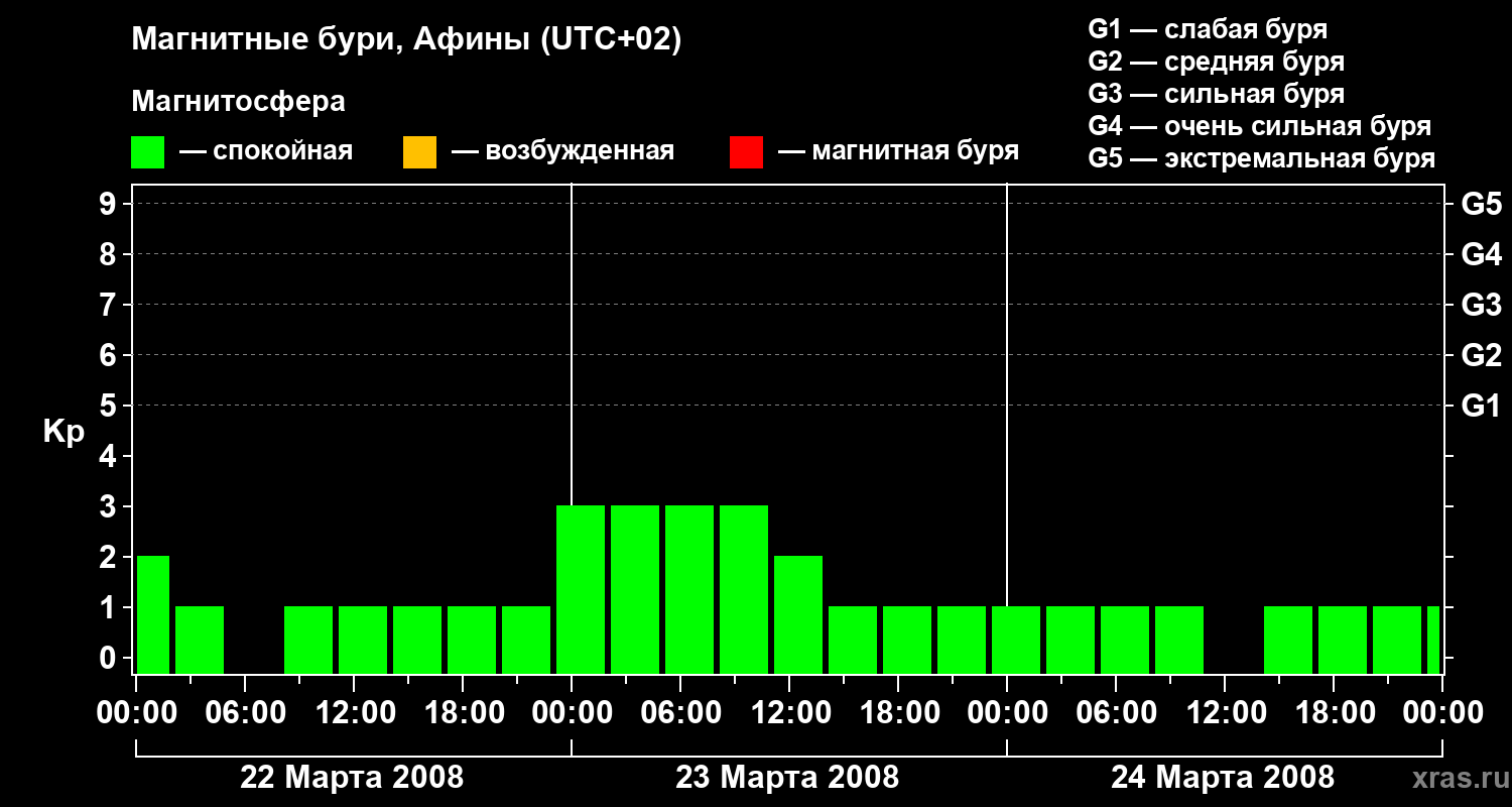 Изменения геомагнитного индекса Kp с 22 по 24 марта 2008 года для средних широт