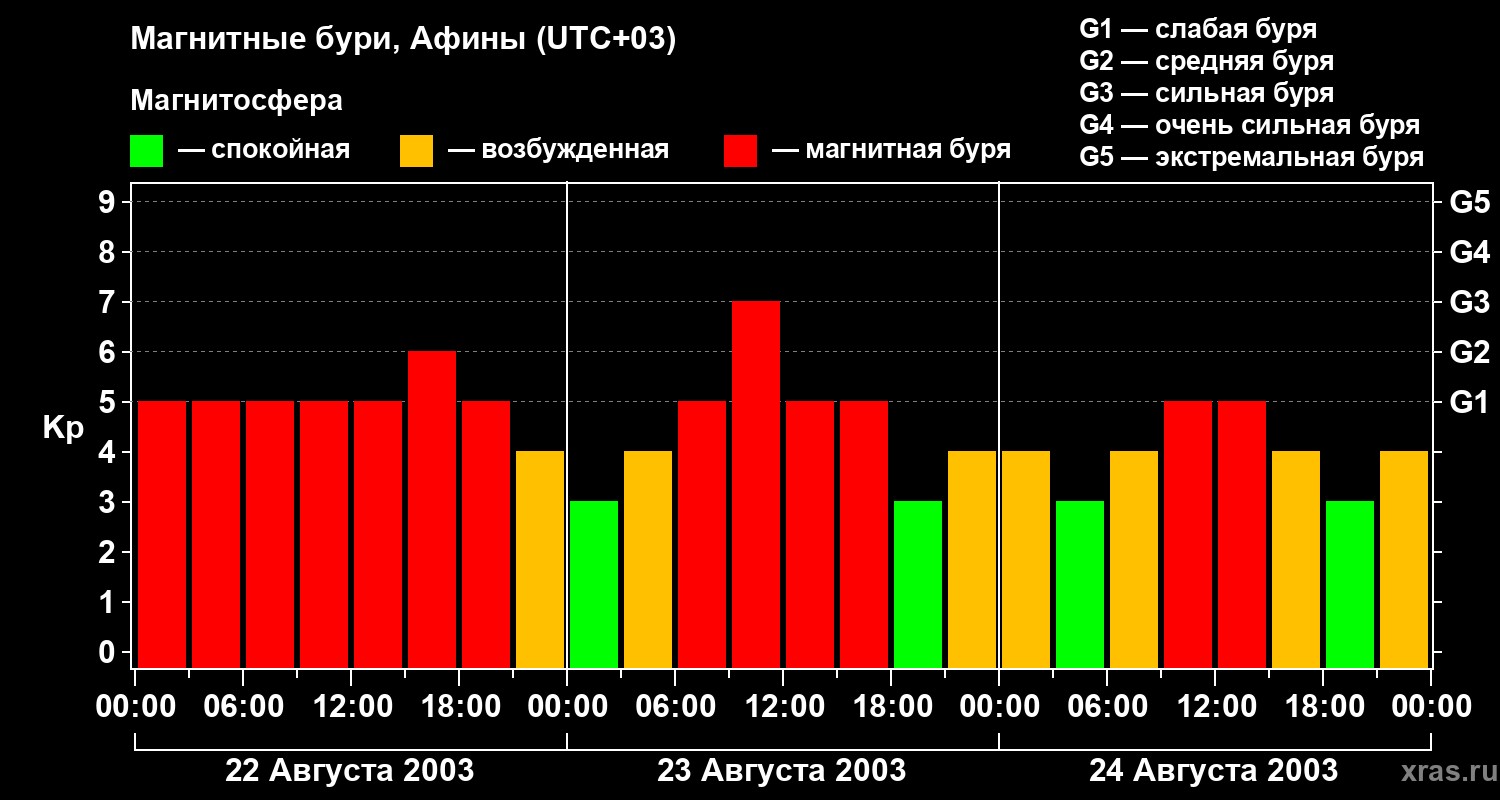 Изменения геомагнитного индекса Kp с 22 по 24 августа 2003 года для средних широт