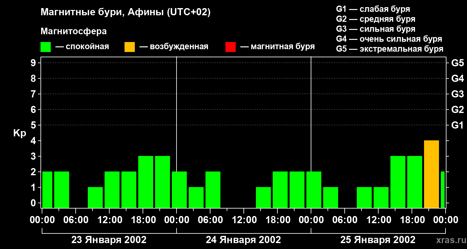 Изменения геомагнитного индекса Kp с 23 по 25 января 2002 года для средних широт