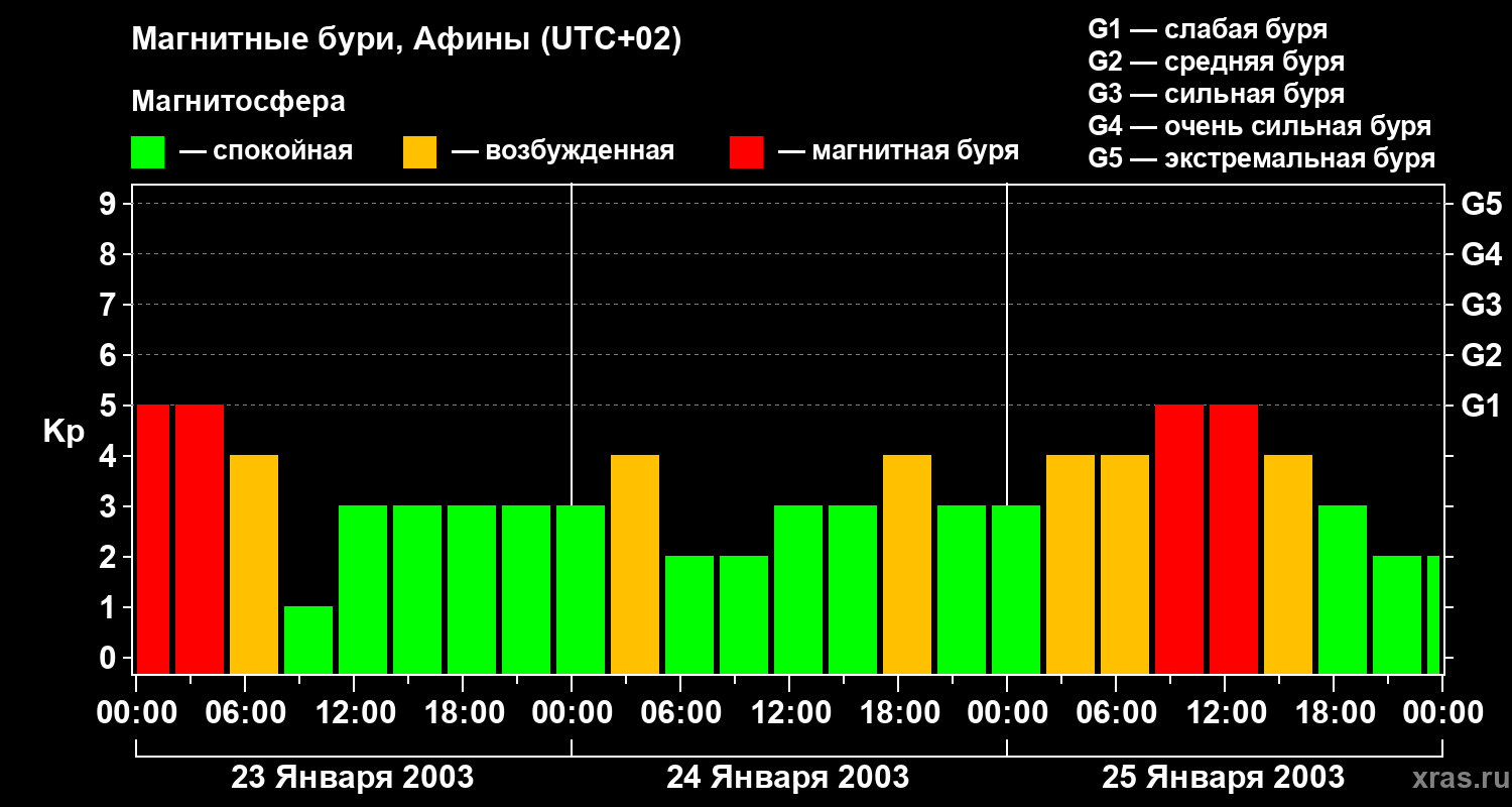 Изменения геомагнитного индекса Kp с 23 по 25 января 2003 года для средних широт