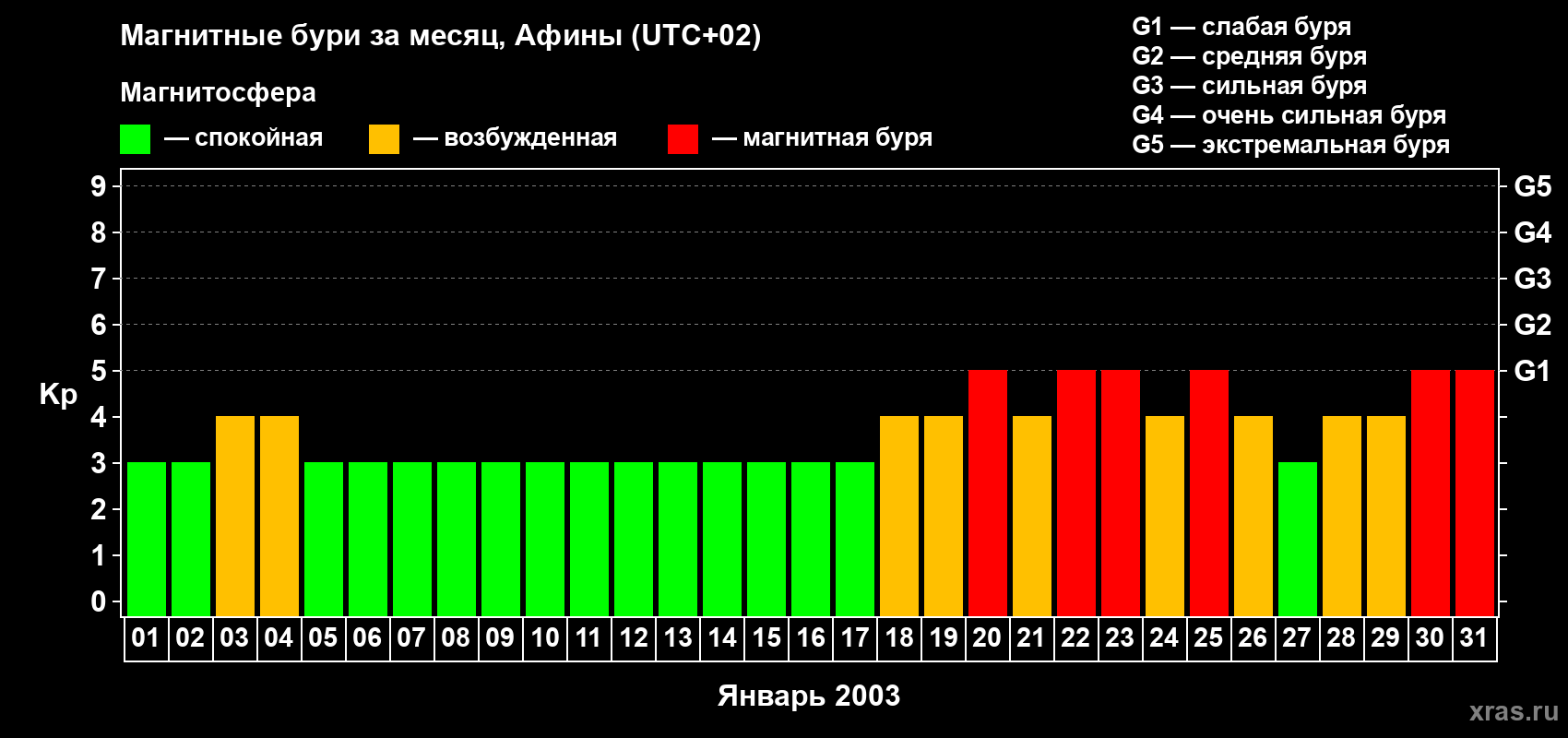 Изменения максимального суточного геомагнитного индекса Kp в январе 2003 года для средних широт