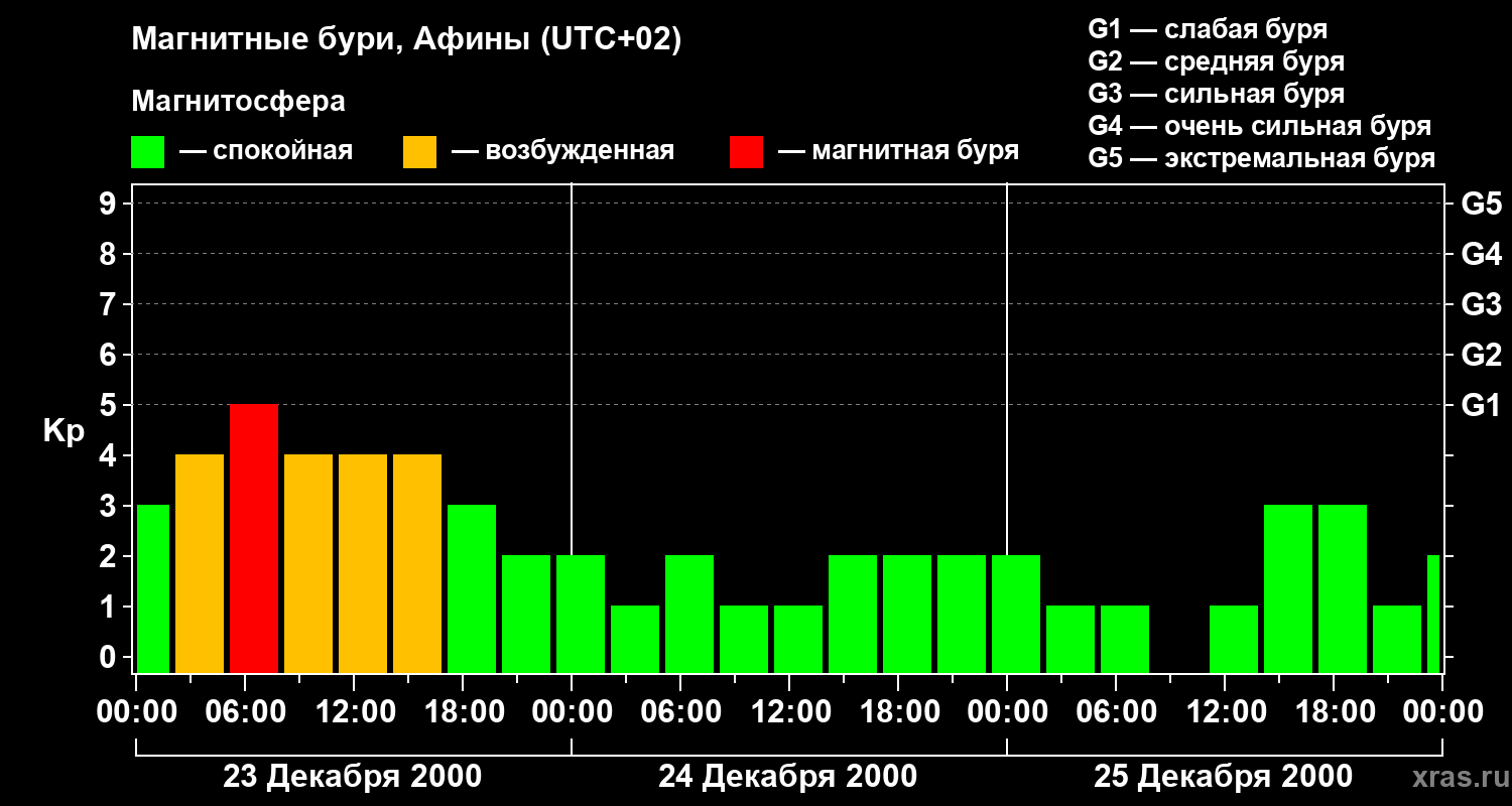 Изменения геомагнитного индекса Kp с 23 по 25 декабря 2000 года для средних широт