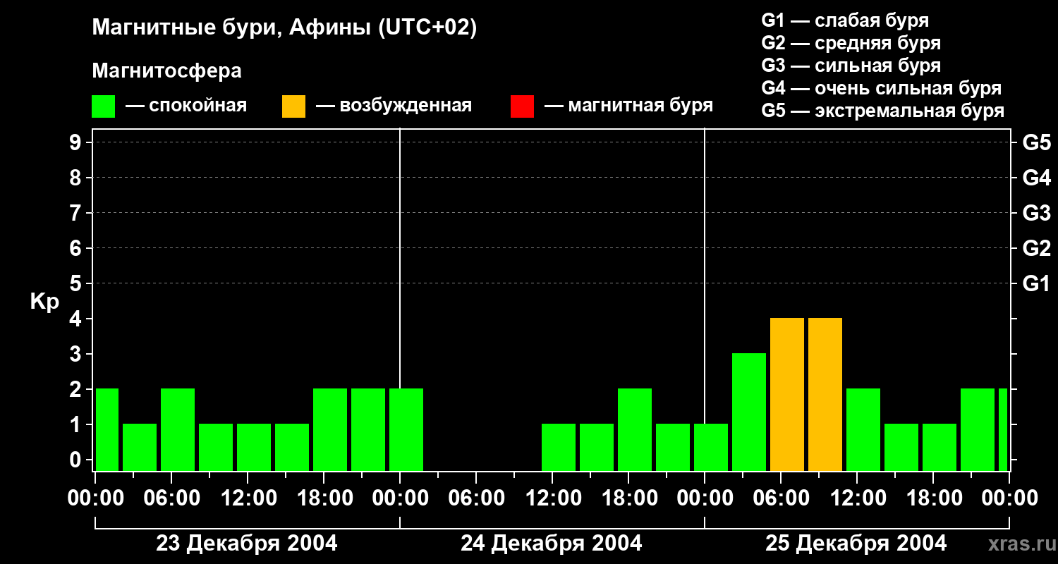 Изменения геомагнитного индекса Kp с 23 по 25 декабря 2004 года для средних широт