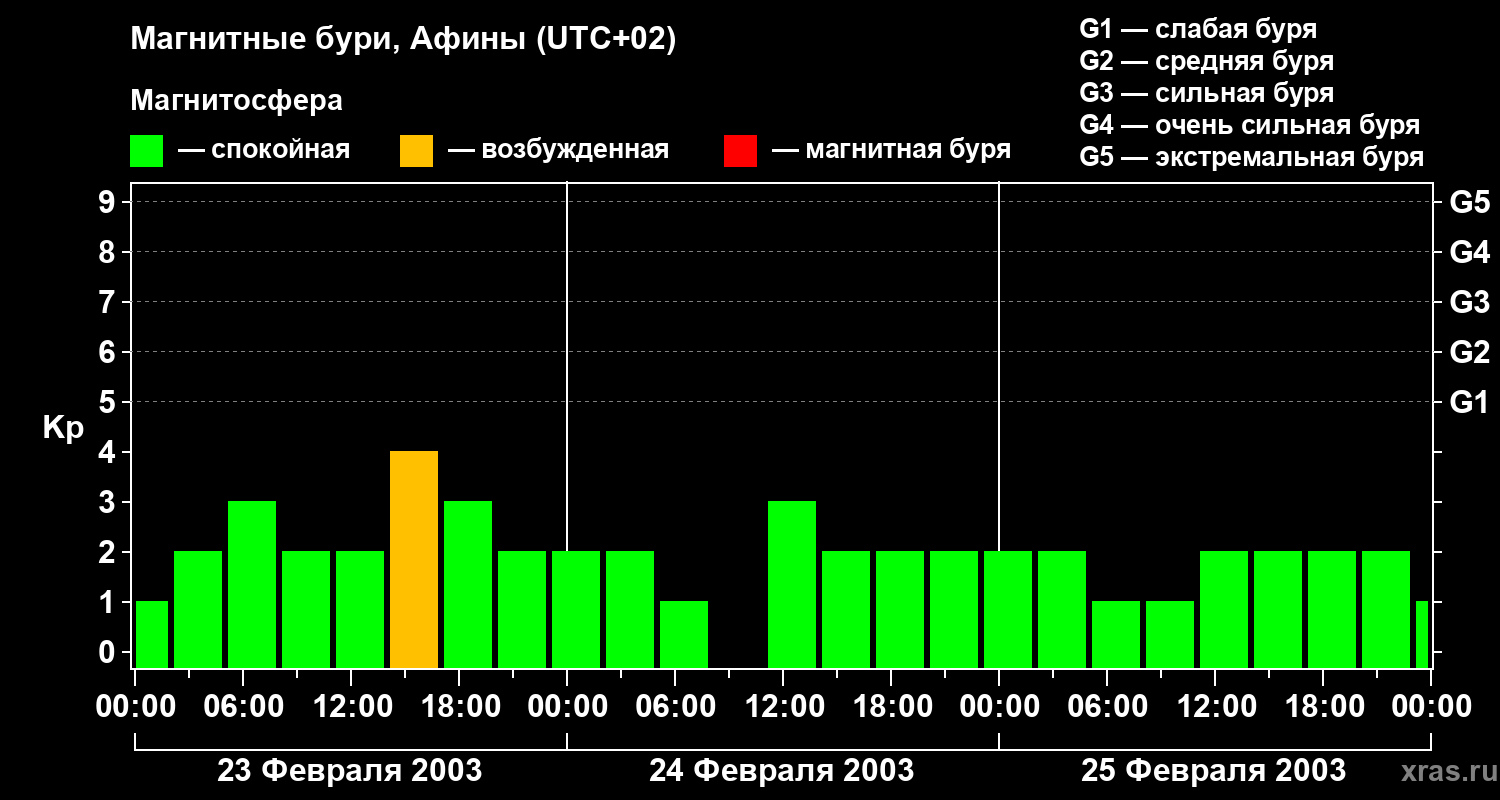 Изменения геомагнитного индекса Kp с 23 по 25 февраля 2003 года для средних широт