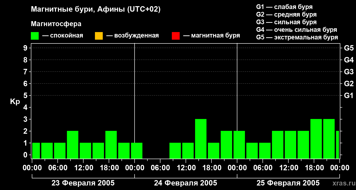 Изменения геомагнитного индекса Kp с 23 по 25 февраля 2005 года для средних широт