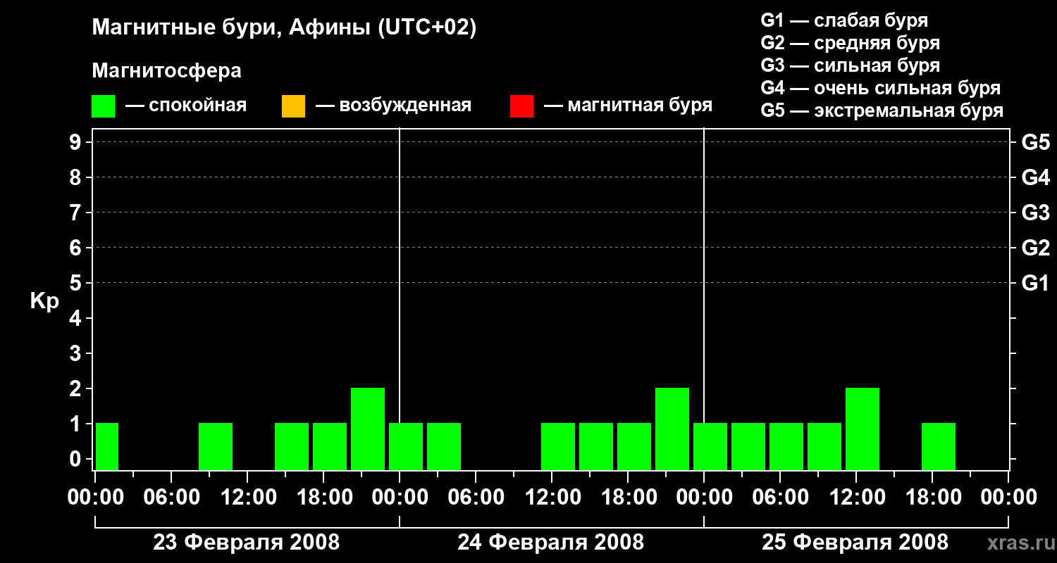 Изменения геомагнитного индекса Kp с 23 по 25 февраля 2008 года для средних широт