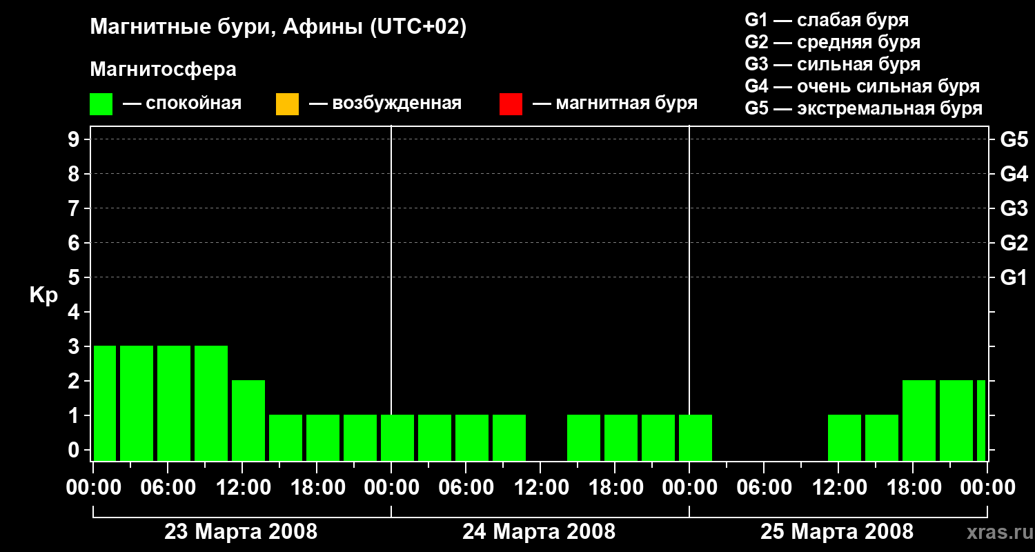 Изменения геомагнитного индекса Kp с 23 по 25 марта 2008 года для средних широт