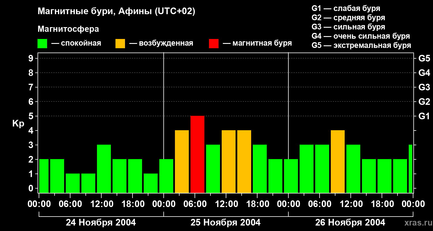 Изменения геомагнитного индекса Kp с 24 по 26 ноября 2004 года для средних широт