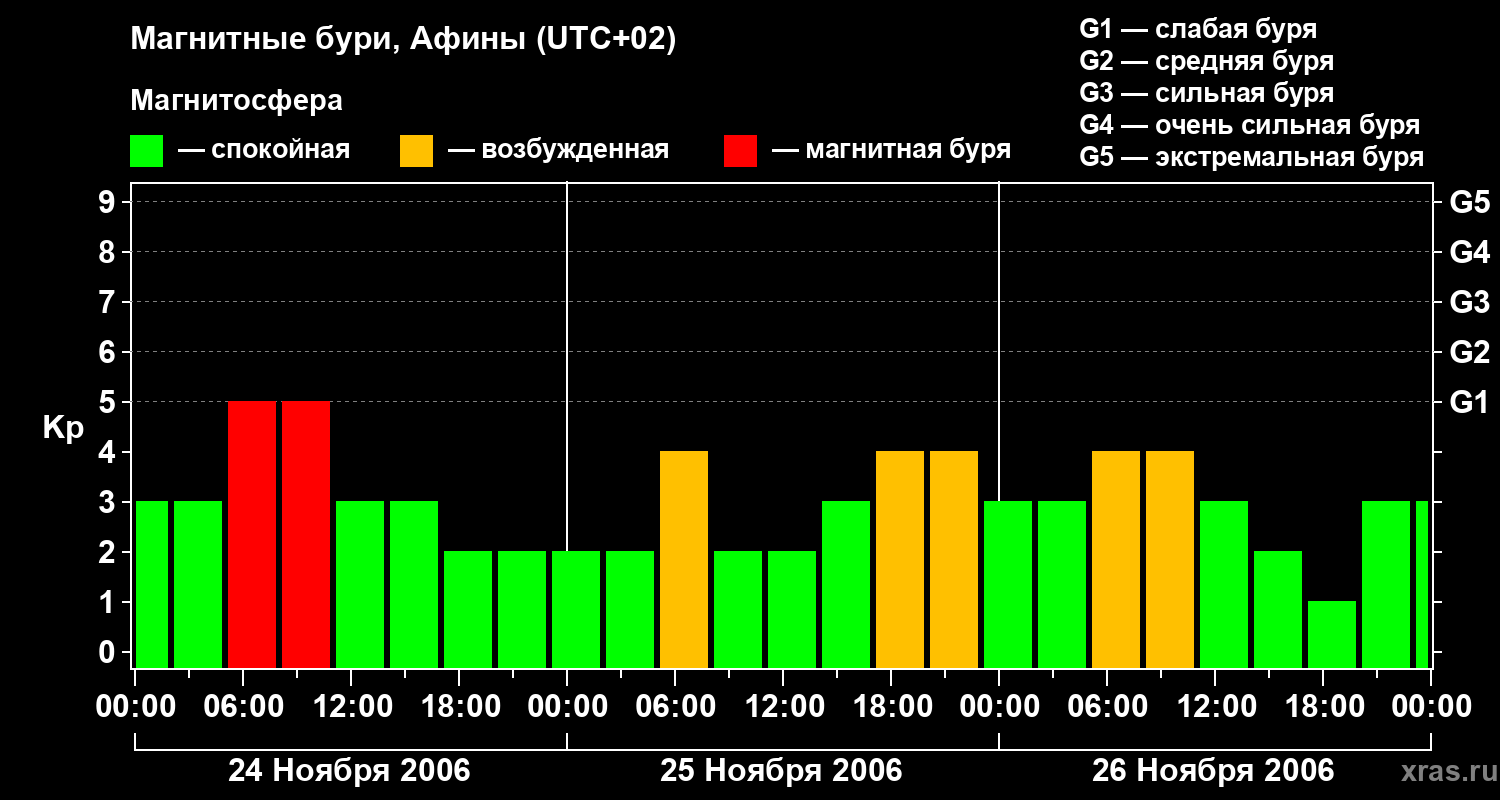 Изменения геомагнитного индекса Kp с 24 по 26 ноября 2006 года для средних широт