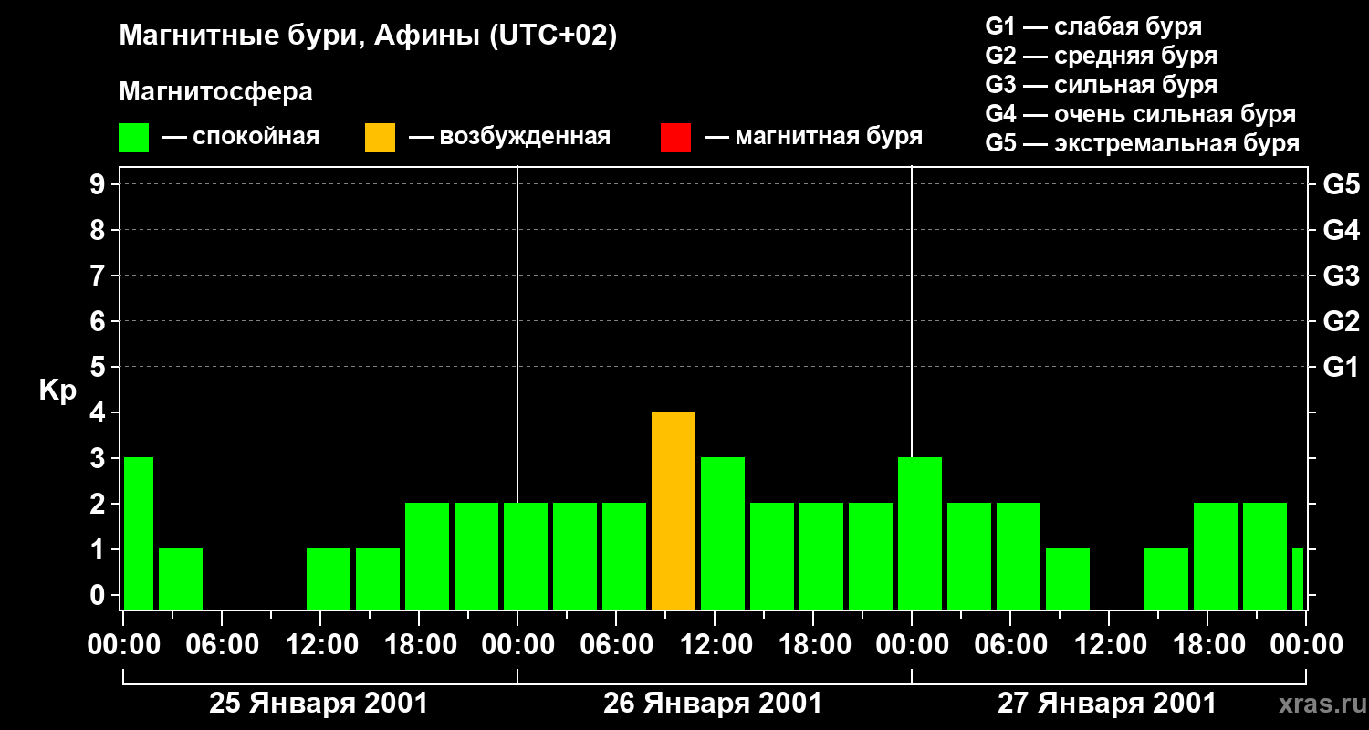 Изменения геомагнитного индекса Kp с 25 по 27 января 2001 года для средних широт