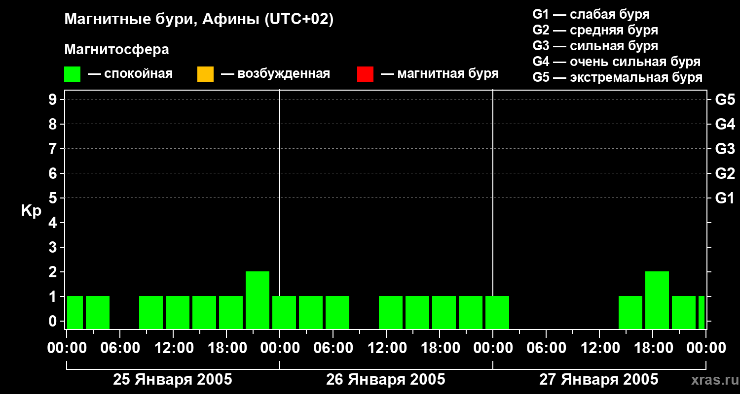 Изменения геомагнитного индекса Kp с 25 по 27 января 2005 года для средних широт