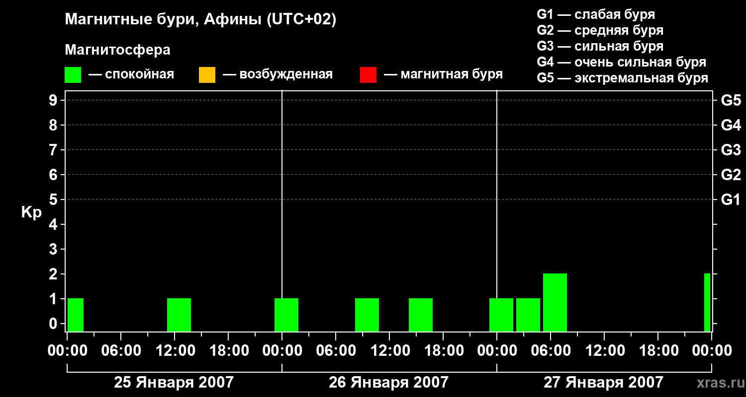 Изменения геомагнитного индекса Kp с 25 по 27 января 2007 года для средних широт
