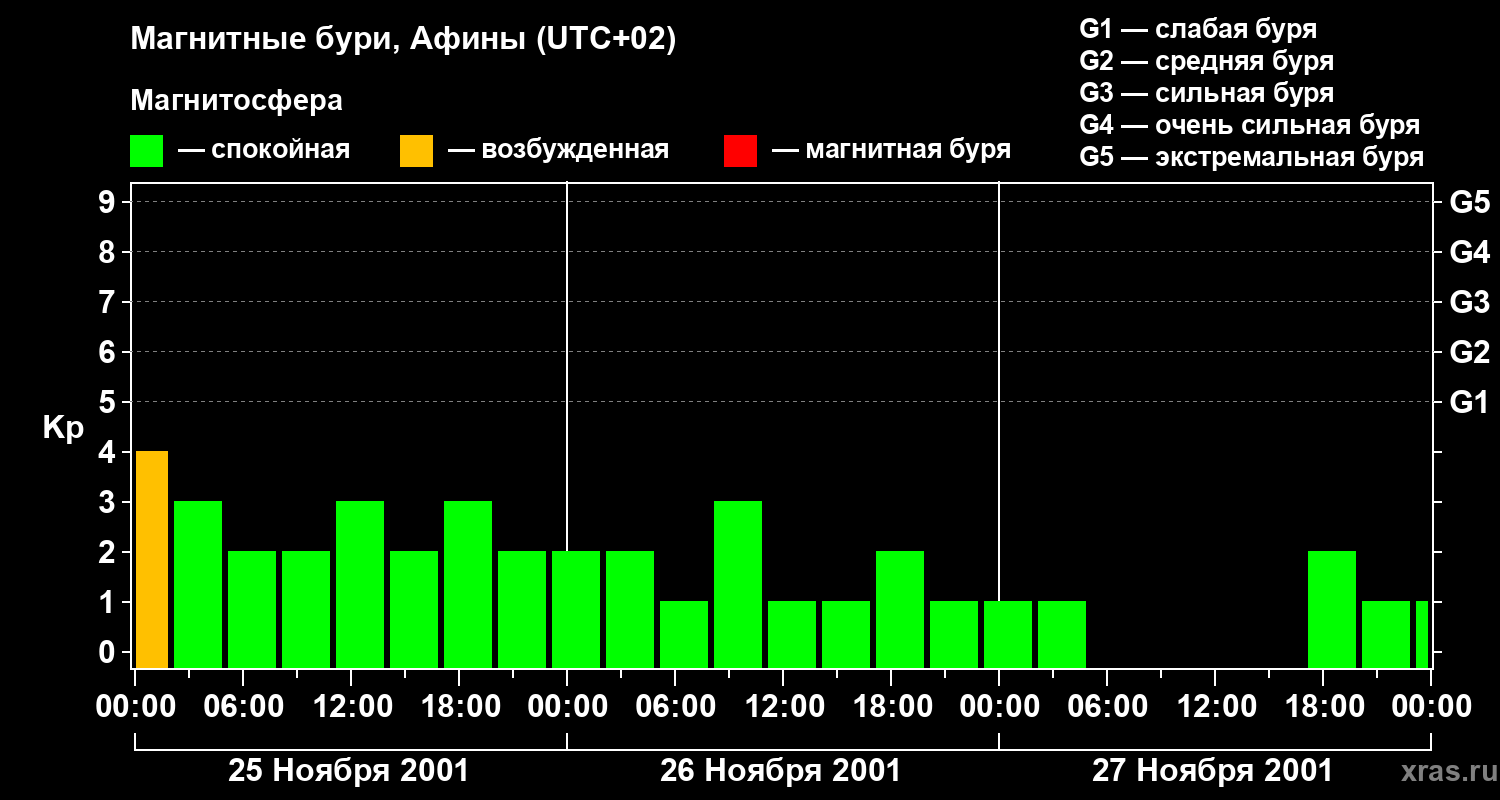 Изменения геомагнитного индекса Kp с 25 по 27 ноября 2001 года для средних широт