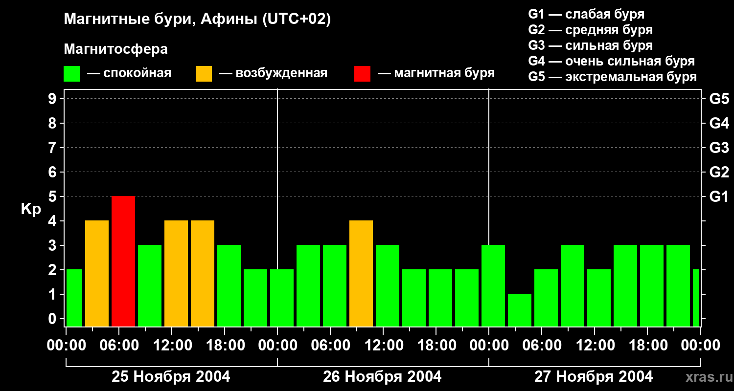 Изменения геомагнитного индекса Kp с 25 по 27 ноября 2004 года для средних широт