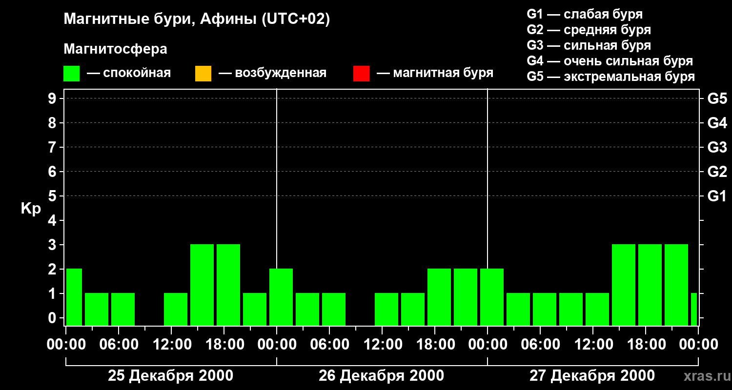 Изменения геомагнитного индекса Kp с 25 по 27 декабря 2000 года для средних широт