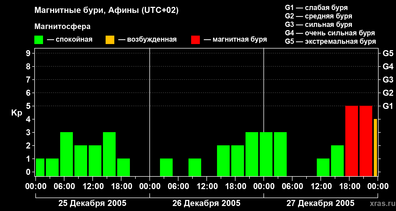 Изменения геомагнитного индекса Kp с 25 по 27 декабря 2005 года для средних широт