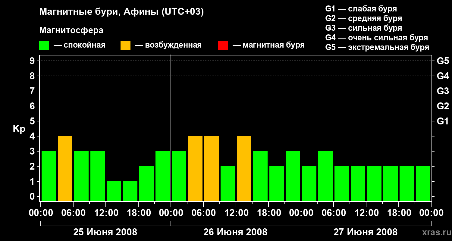 Изменения геомагнитного индекса Kp с 25 по 27 июня 2008 года для средних широт
