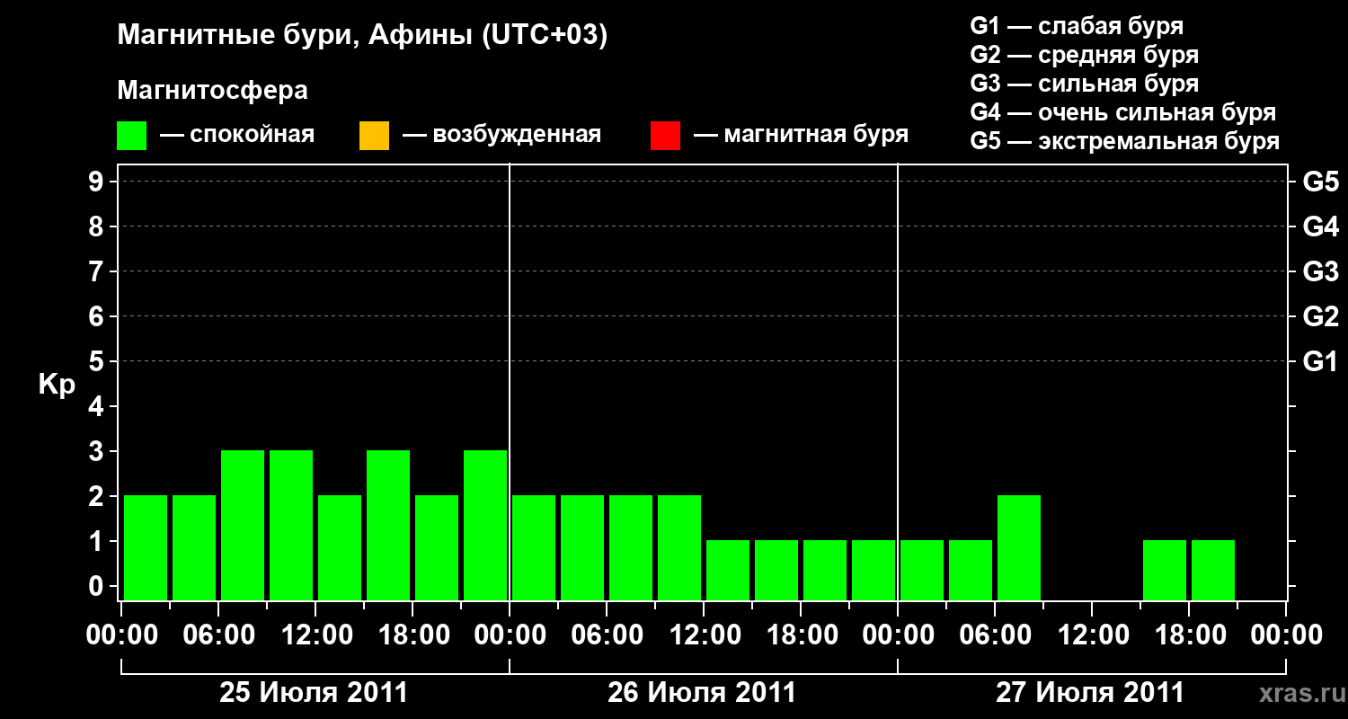 Изменения геомагнитного индекса Kp с 25 по 27 июля 2011 года для средних широт