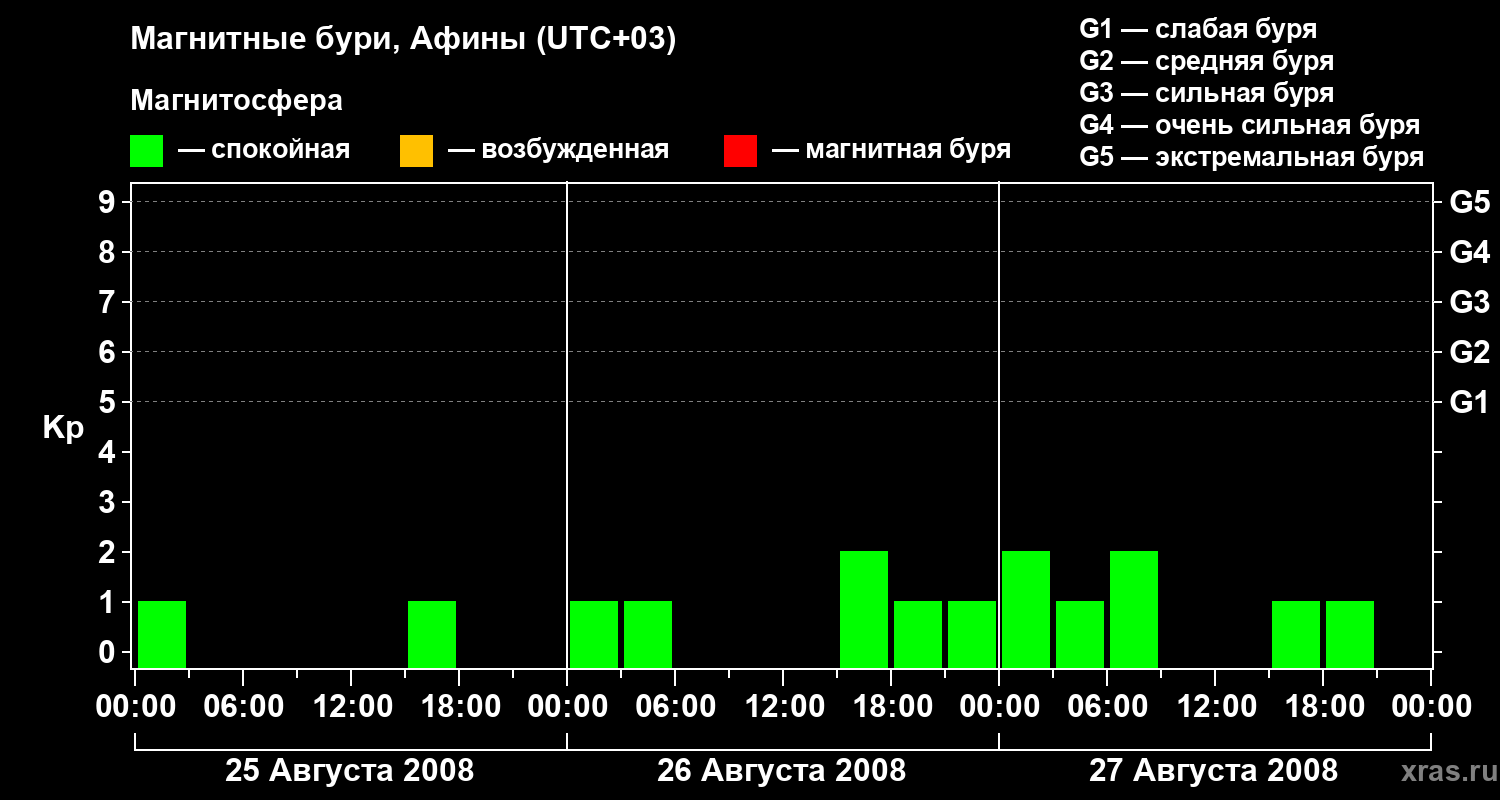Изменения геомагнитного индекса Kp с 25 по 27 августа 2008 года для средних широт