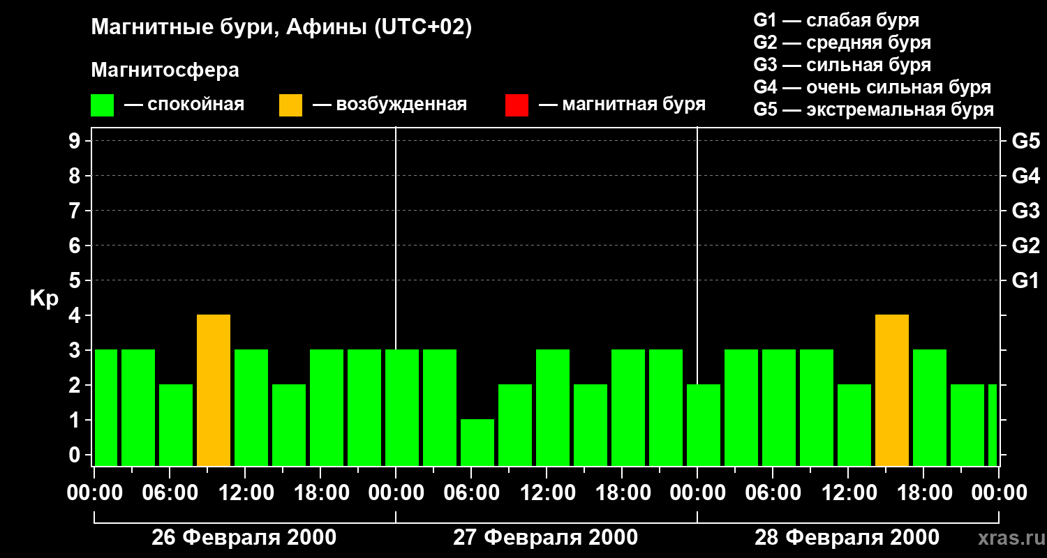 Изменения геомагнитного индекса Kp с 26 по 28 февраля 2000 года для средних широт