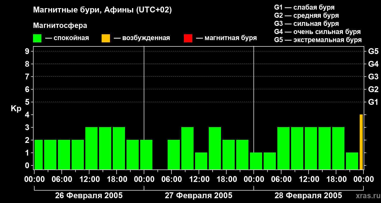 Изменения геомагнитного индекса Kp с 26 по 28 февраля 2005 года для средних широт