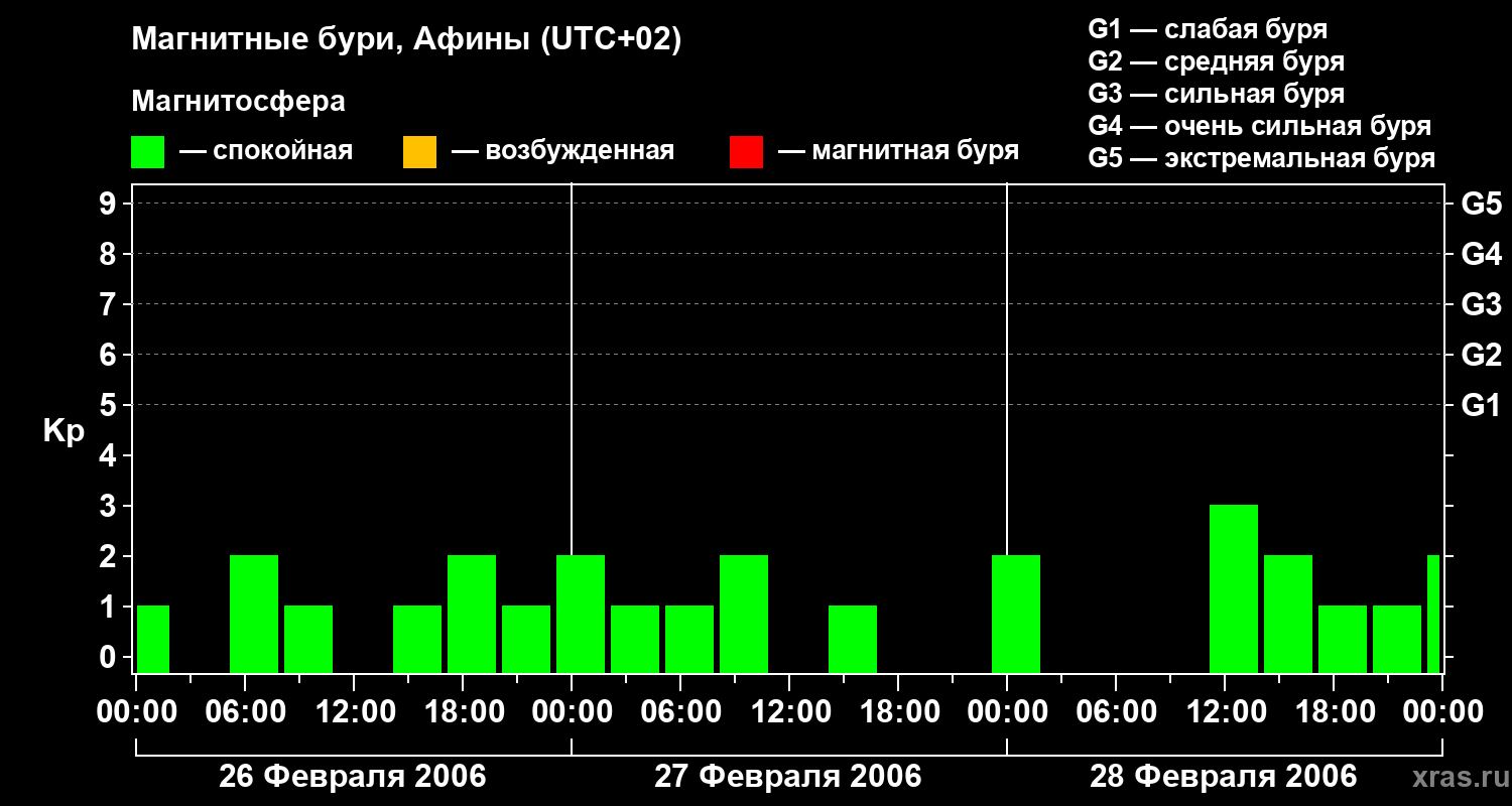 Изменения геомагнитного индекса Kp с 26 по 28 февраля 2006 года для средних широт