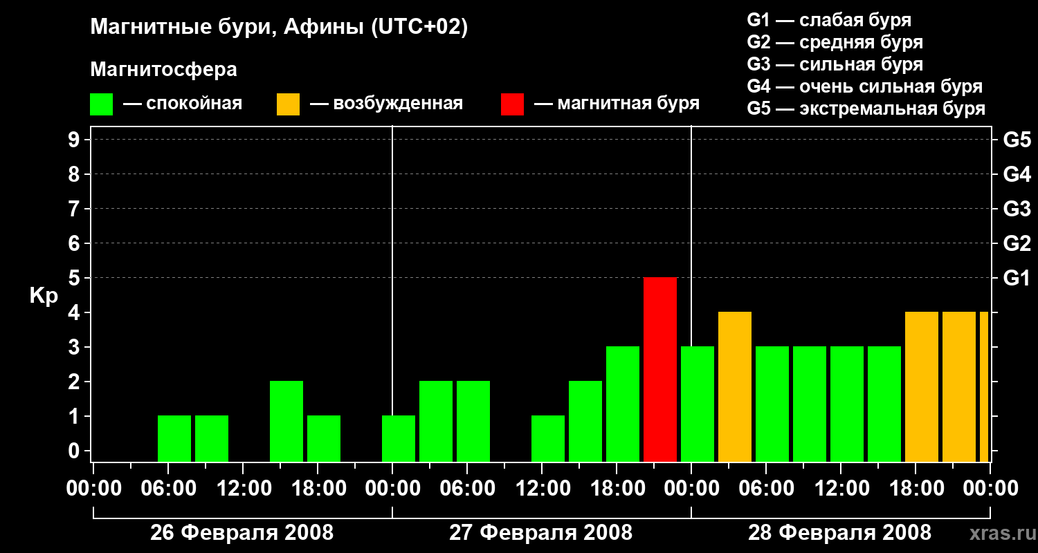 Изменения геомагнитного индекса Kp с 26 по 28 февраля 2008 года для средних широт