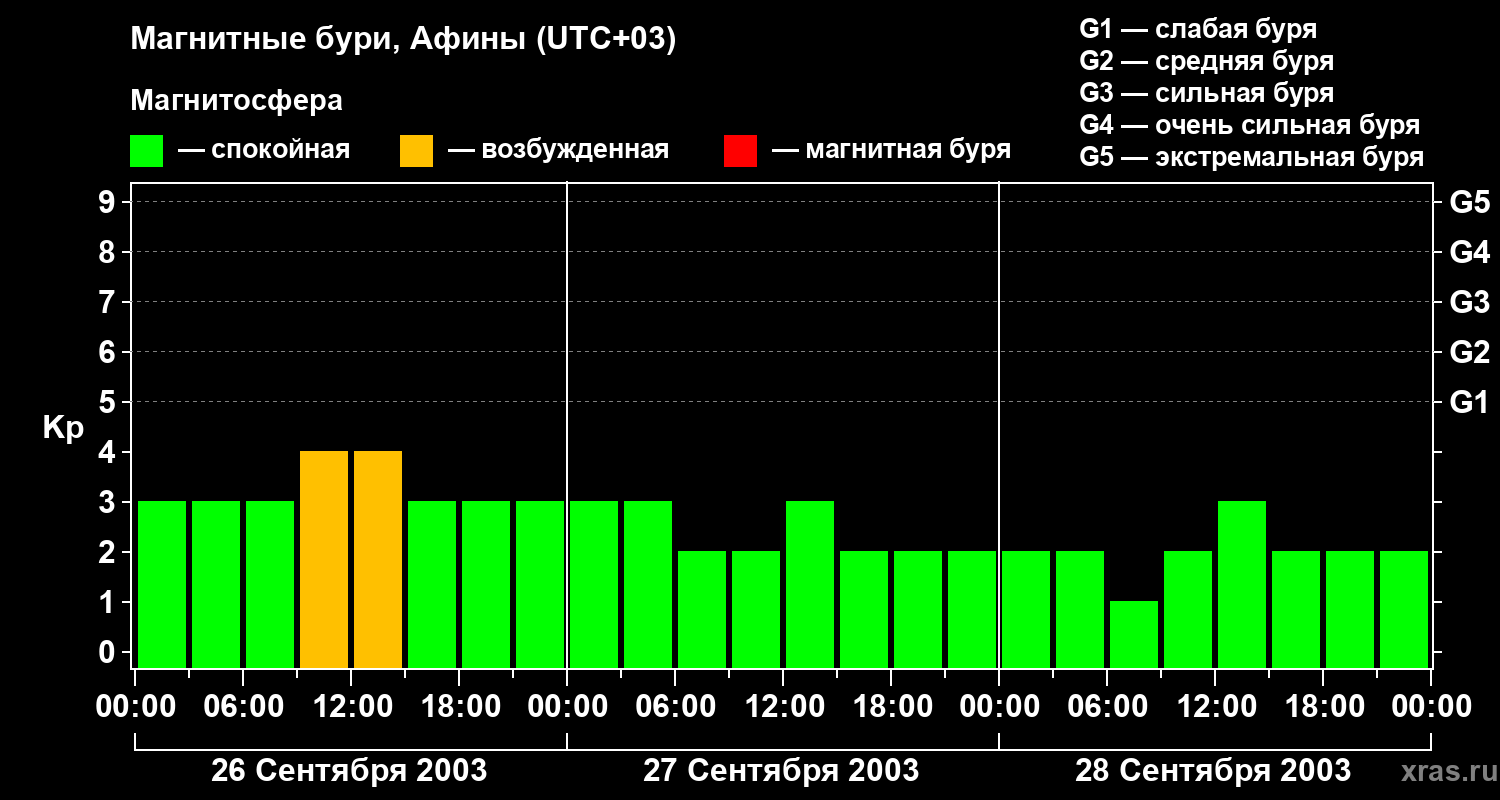 Изменения геомагнитного индекса Kp с 26 по 28 сентября 2003 года для средних широт