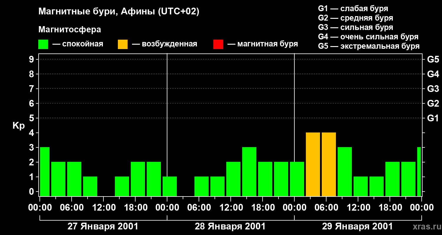 Изменения геомагнитного индекса Kp с 27 по 29 января 2001 года для средних широт
