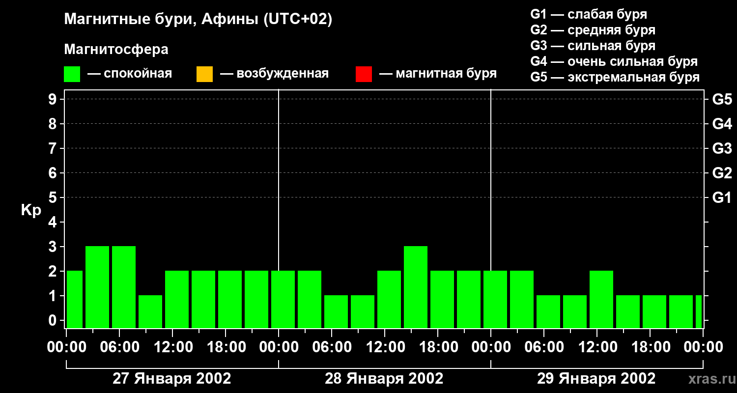 Изменения геомагнитного индекса Kp с 27 по 29 января 2002 года для средних широт