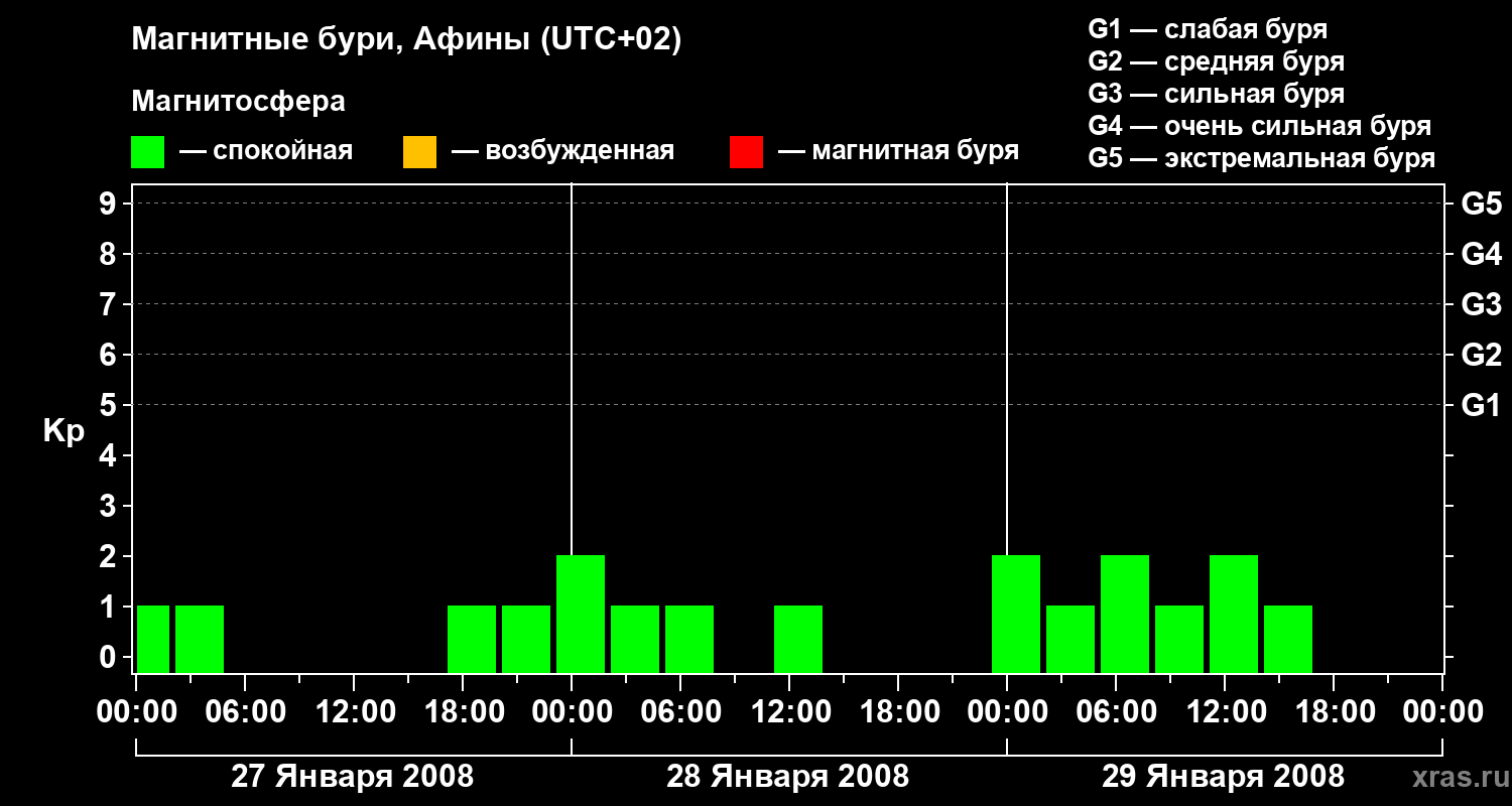 Изменения геомагнитного индекса Kp с 27 по 29 января 2008 года для средних широт