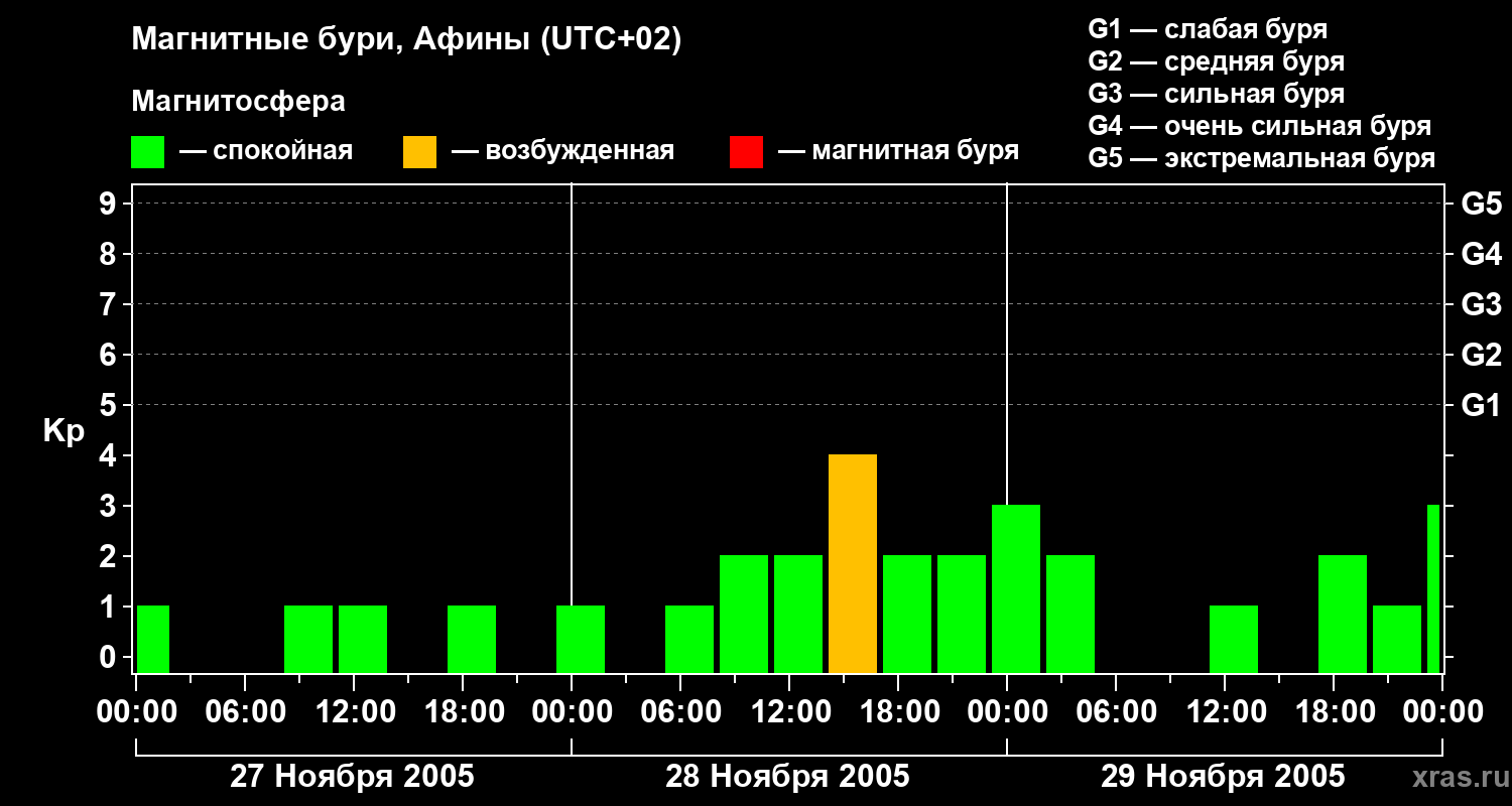 Изменения геомагнитного индекса Kp с 27 по 29 ноября 2005 года для средних широт