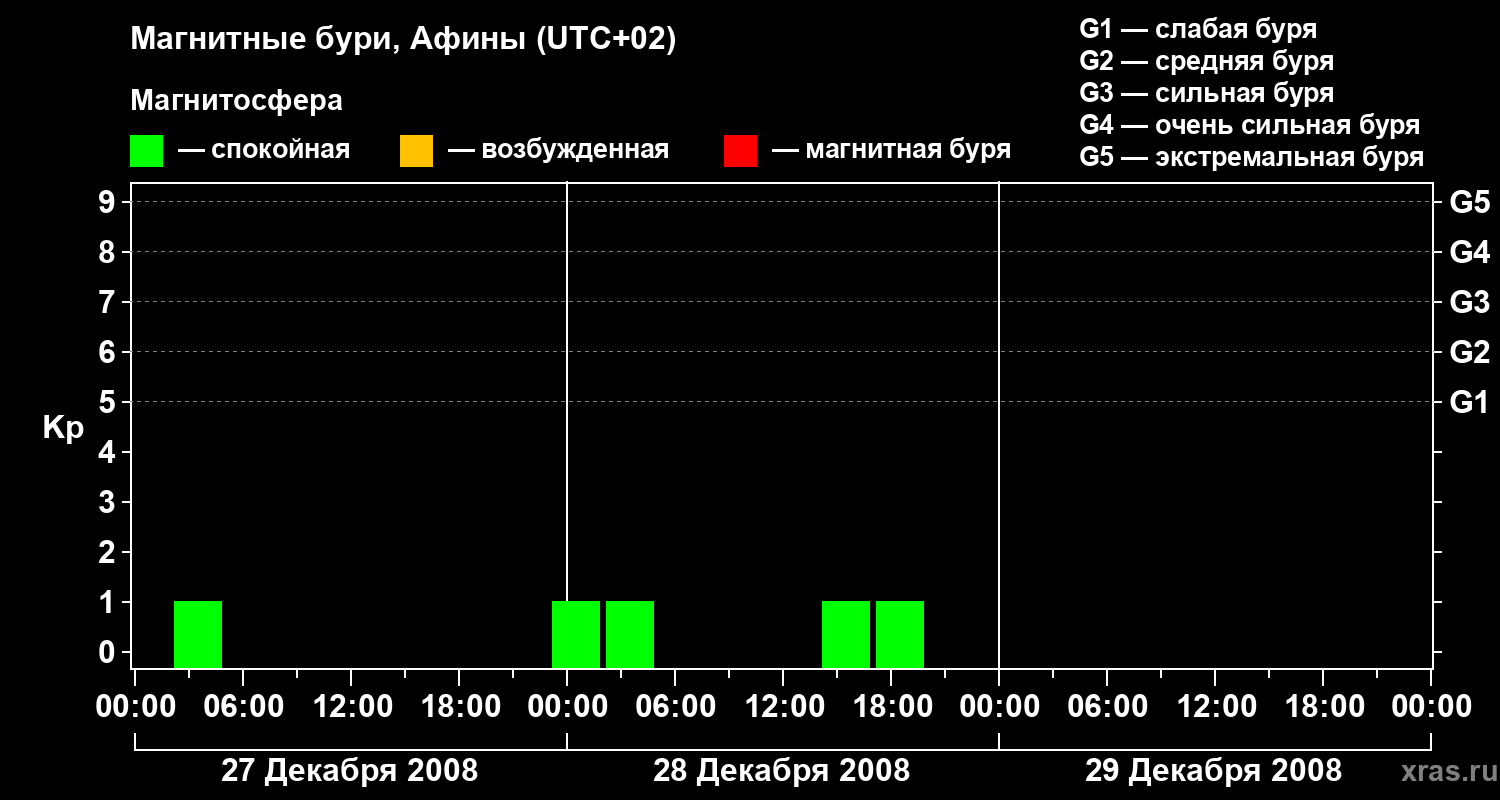 Изменения геомагнитного индекса Kp с 27 по 29 декабря 2008 года для средних широт