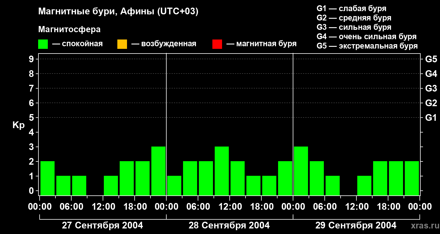 Изменения геомагнитного индекса Kp с 27 по 29 сентября 2004 года для средних широт