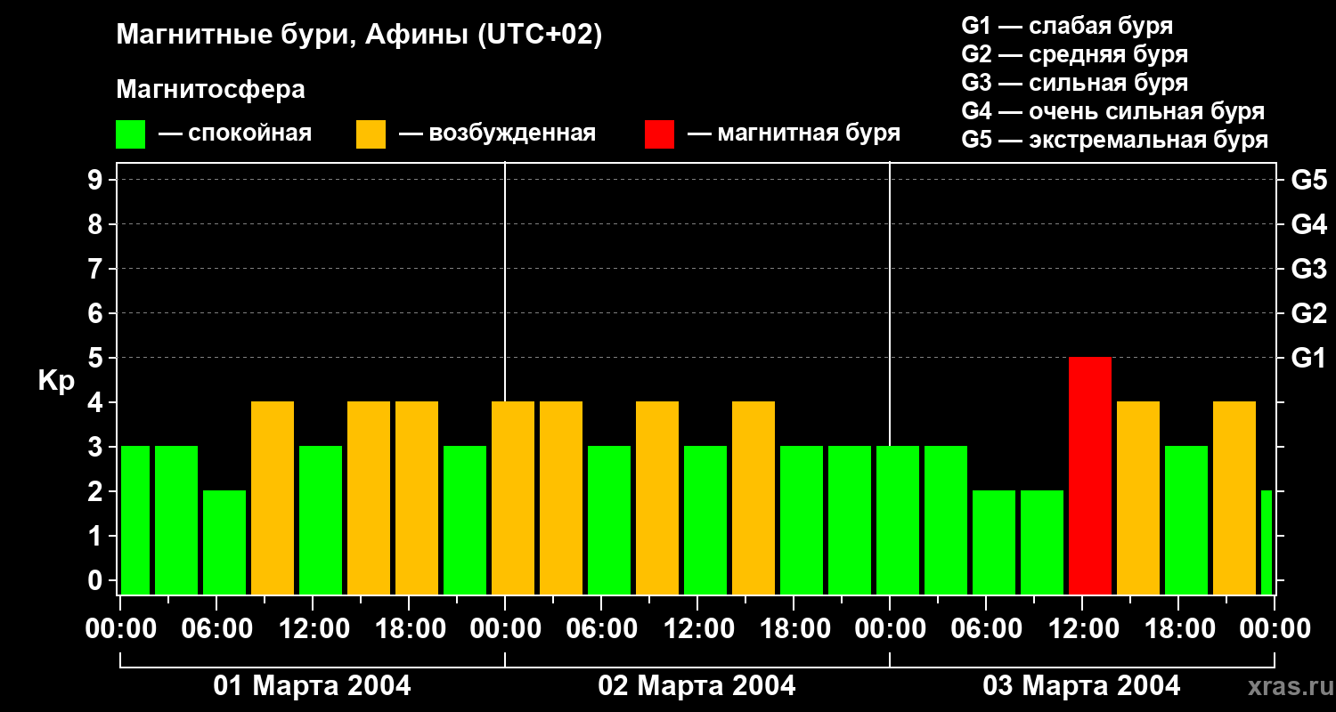 Изменения геомагнитного индекса Kp с 1 по 3 марта 2004 года для средних широт