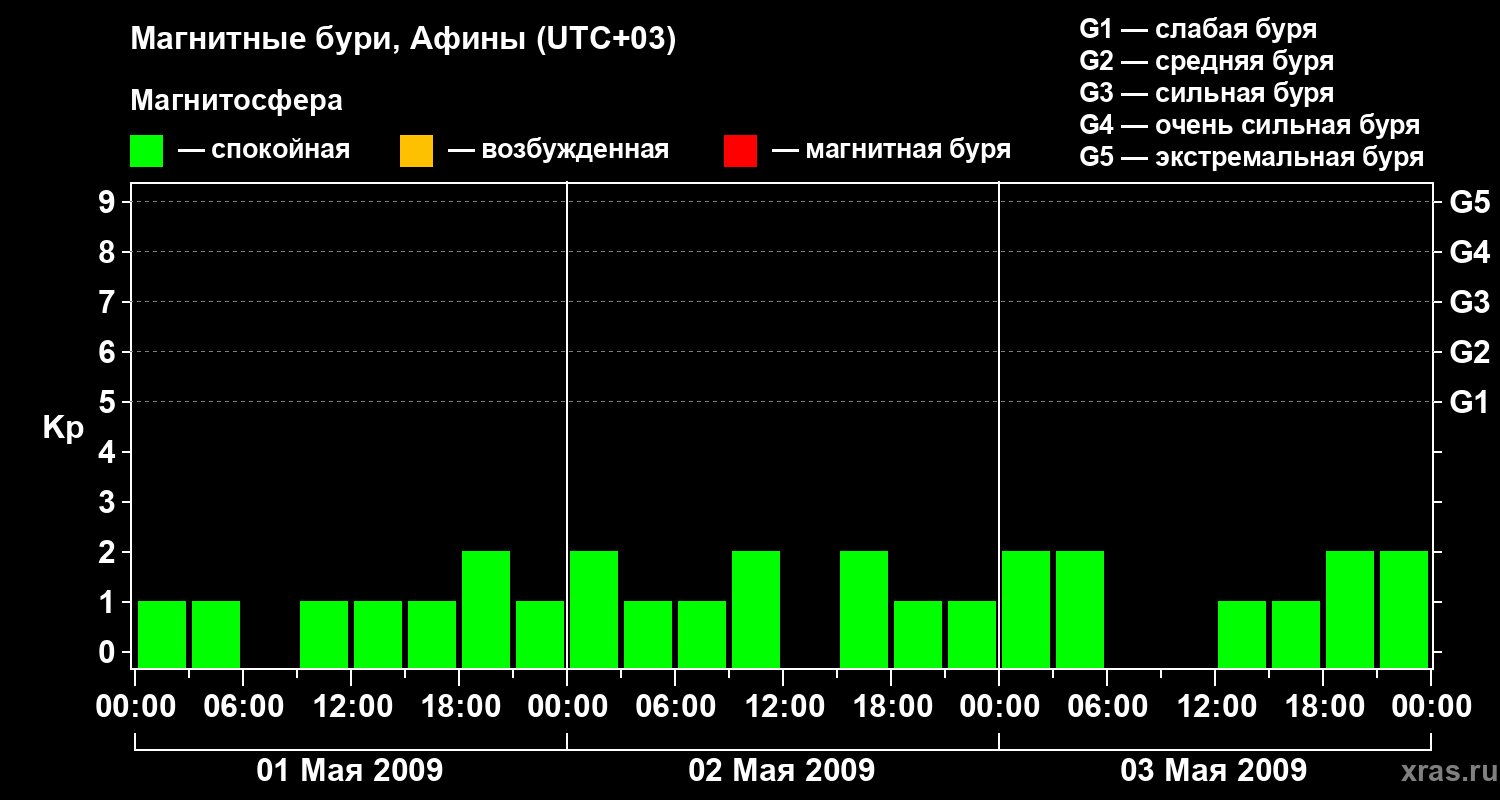 Изменения геомагнитного индекса Kp с 1 по 3 мая 2009 года для средних широт