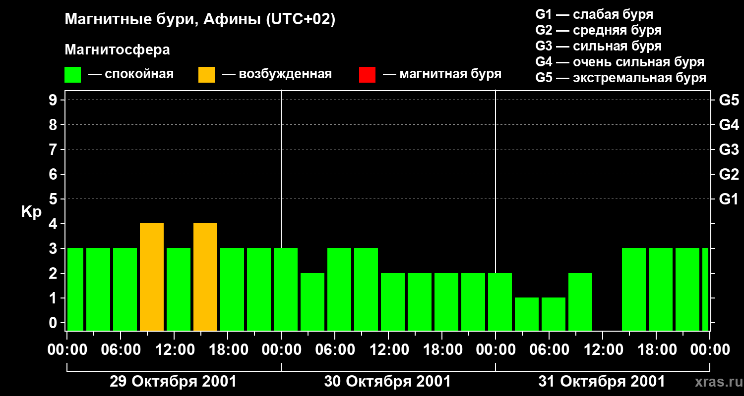Изменения геомагнитного индекса Kp с 29 по 31 октября 2001 года для средних широт